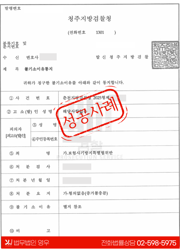 수사기관은 의뢰인의 보험 청구에 사기 고의가 없었다는 점을 인정해 ‘혐의없음’으로 불기소 처분을 내렸습니다.