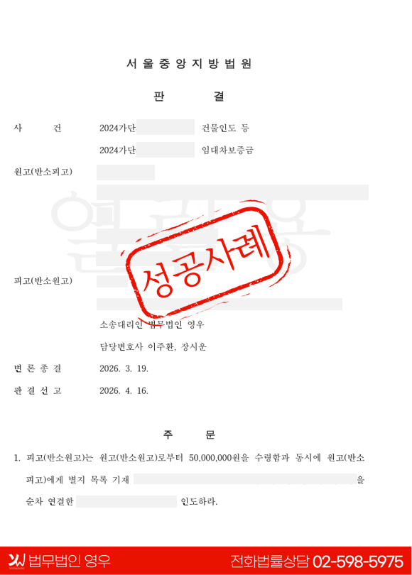 의뢰인은 보증금을 반환받지 못한 상태에서 퇴거 압박까지 받는 이중고에 놓였습니다. 당 법인은 의뢰인을 대리하여 본소에 적극 대응하는 한편, 보증금 반환을 구하는 반소를 제기하였습니다.