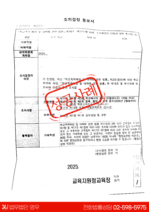 학교폭력 사안의 경우, 4호 이상의 조치가 내려질 경우 해당 내용이 학교생활기록부에 기재되어 학생의 장래에 중대한 영향을 미칠 수 있으므로, 이러한 결과를 사전에 예방하고 신중하게 대응하기 위해서는 변호인의 조력이 필요합니다.