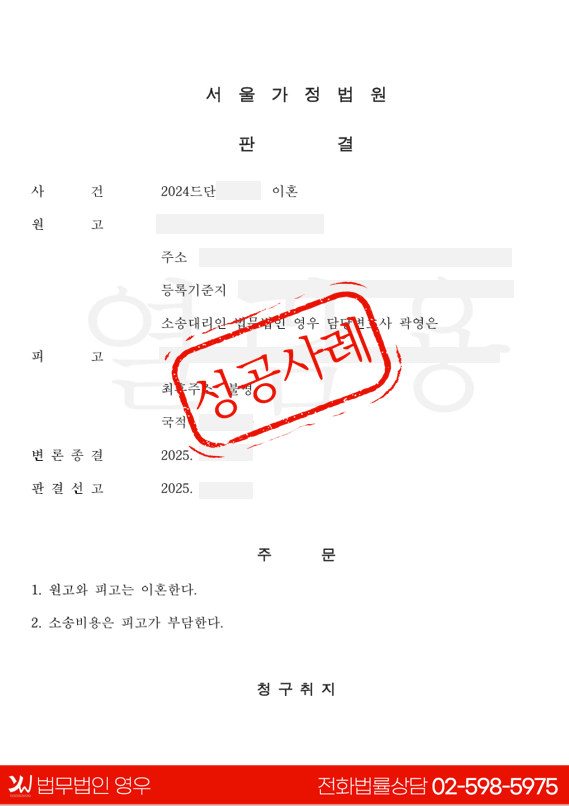 국제결혼의 복잡한 현실을 고려하여, 의뢰인이 진심으로 가정을 이루고자 했던 점, 경제적·정서적으로 일방적인 희생을 감내해온 과정을 진정성 있게 설명하여 재판부의 공감을 이끌어냈습니다.