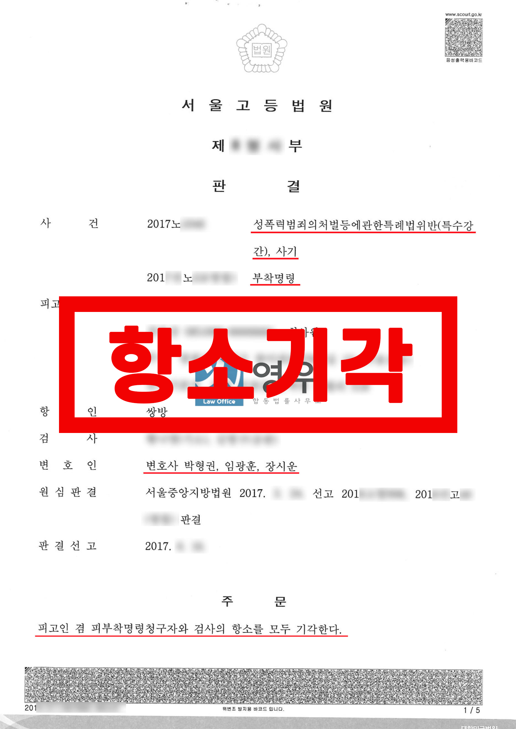 1심 법원은 이와 같은 의뢰인의 사정과 이 사건의 발생경위를 유리한 정상으로 참작하여 검사의 항소를 기각하였고 피고인과 검사 모두 항소하지 않아 그 판결이 확정되었습니다.