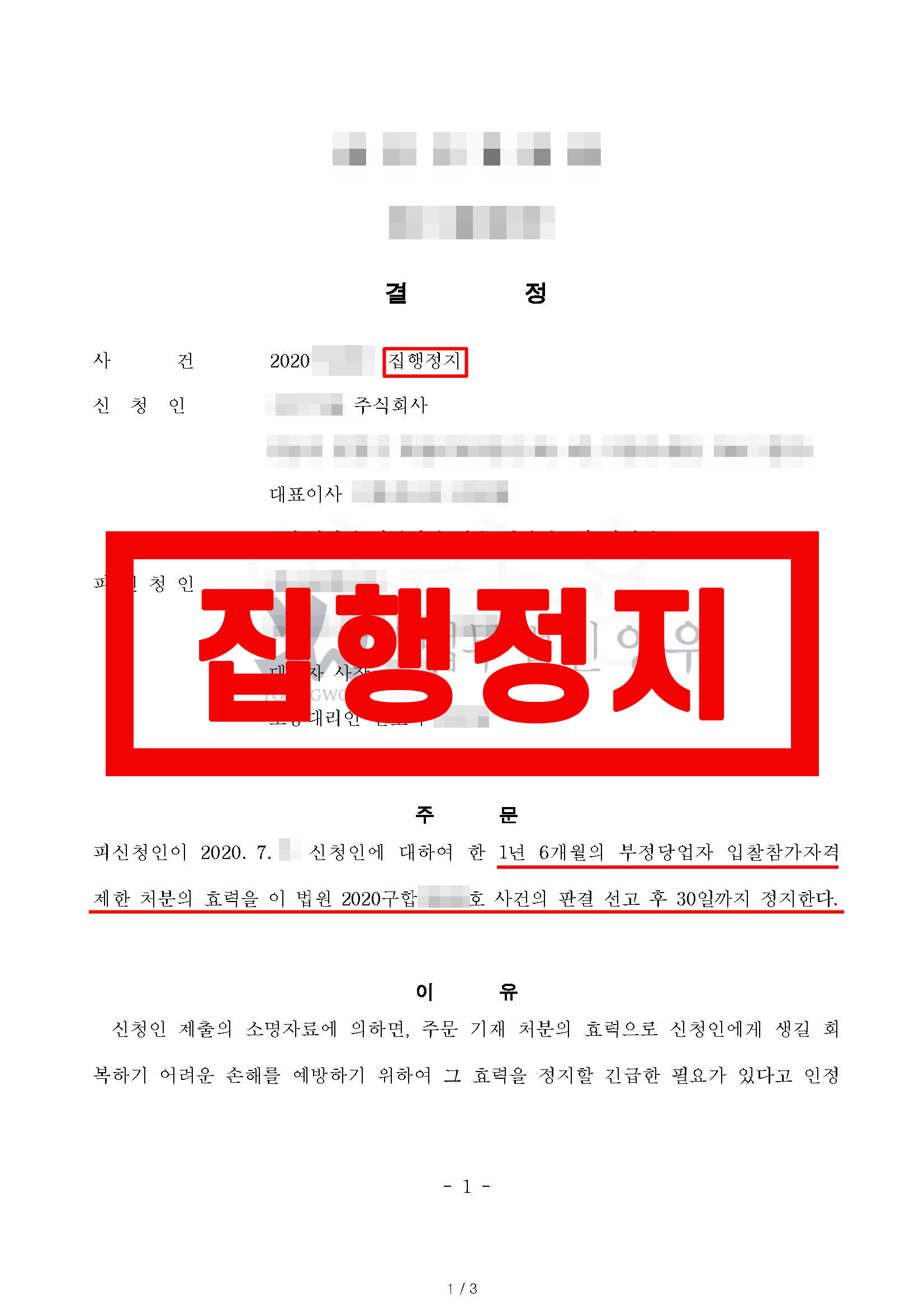 피선칭인이 2020. 7. *. 신청인에 대하여 한 1년 6개월의 부정당업자 입찰참가자격제한 처분의 효력을 이 법원 2020구합OOOOO호 사건의 판결 선고 후 30일까지 정지한다.