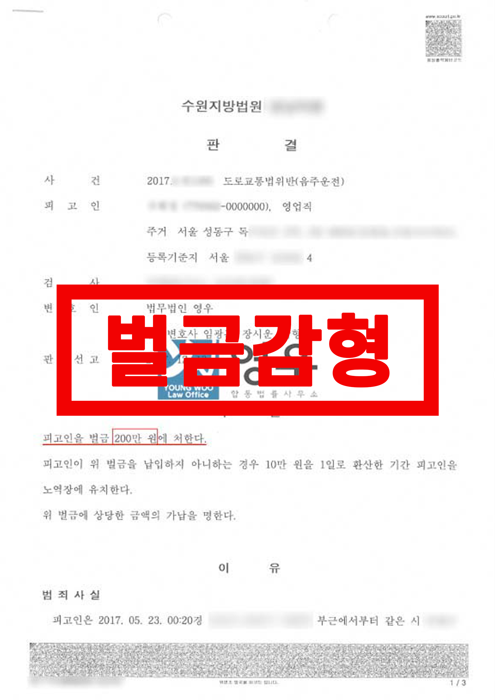 1심 법원은 이와 같은 의뢰인의 사정과 이 사건의 발생경위를 유리한 정상으로 참작하여 의뢰인에게 벌금 100만 원을 감형한 벌금 200만 원의 형을 선고하였습니다.