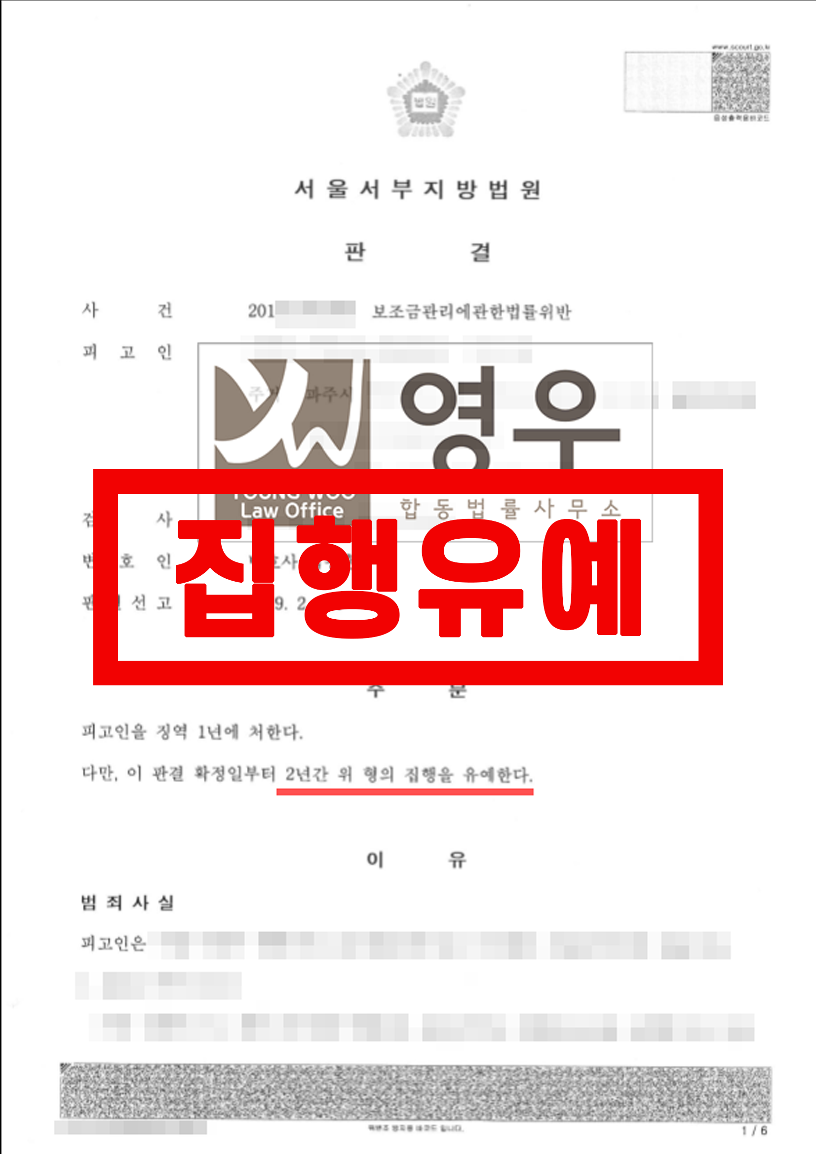 법무법인 영우의 변호사는 피고인의 사건 당시 정황과 그 이후 반성하는 모습 및 기타 유리한 정황을 최대한 구체적으로 부각하였고, 집행유예를 선고하여 줄 것을 강력하게 주장하였습니다.