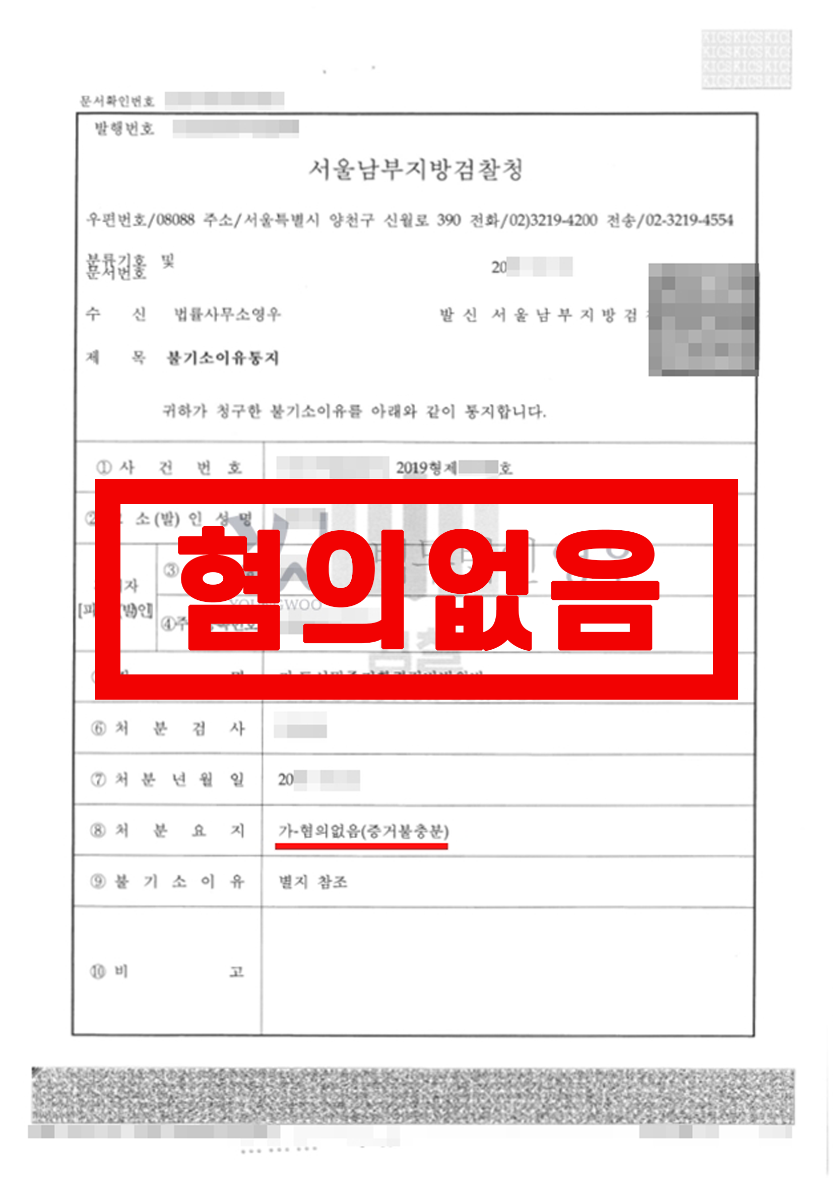 피의자에 대한 범죄혐의점 증거불충분으로 불기소(혐의없음).