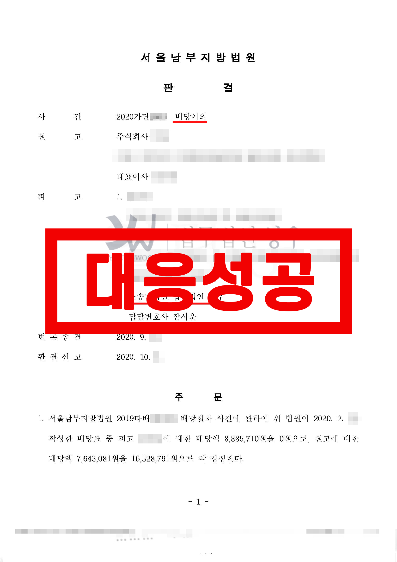 1. 서울남부지방법원 2019타배****** 배당절차 사건에 관하여 위 법원이 2020. 2. **. 작성한 배당표 중 피고 OOO에 대한 배당액 8,885,710원을 0원으로, 원고에 대한 배당액 7,643,081원을 16,528,791원으로 각 경정한다.