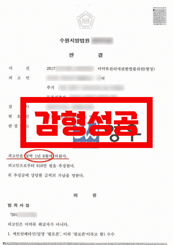 1심 법원은 이와 같은 의뢰인의 사정과 이 사건의 발생경위를 유리한 정상으로 참작하여 의뢰인에게 검찰의 구형보다 1년 6개월을 감형한 징역 1년 6월을 선고하였습니다.